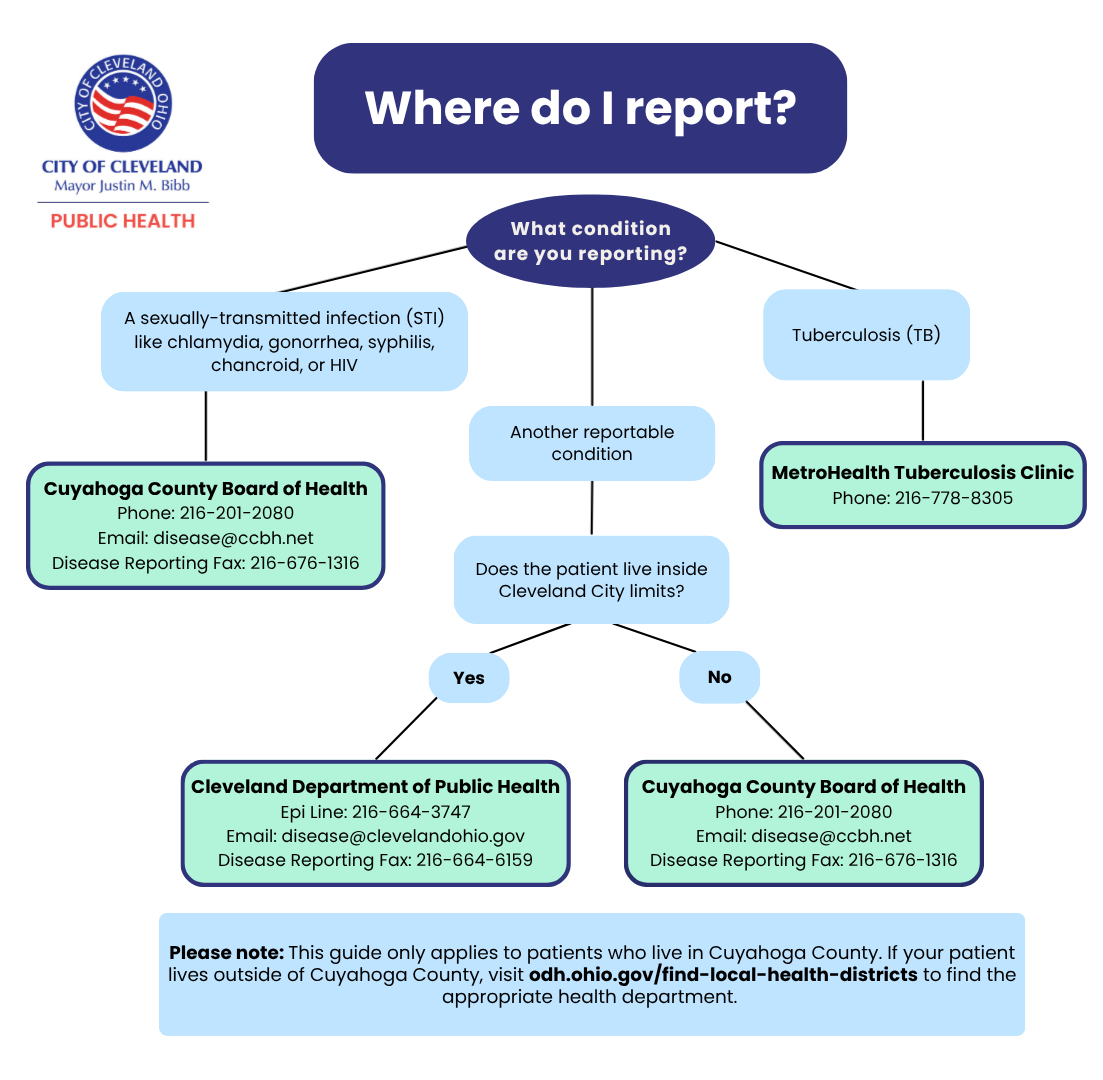 Under Ohio law, healthcare providers, hospitals, and laboratories are required to report cases of certain infectious diseases to the Cleveland Department of Public Health (CDPH) within a specific timeframe. Reporting these illnesses helps us track the spread of disease, prevent outbreaks, and keep Cleveland healthy.